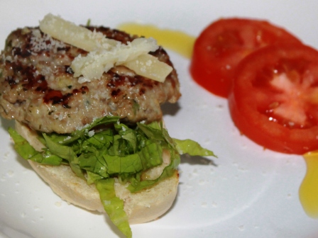 - Para servir se puede tostar unas rebanadas de pan, untar ajo y regar con aceite. Poner un poco de lechuga cortada en juliana y acompañar con tomate. Colocar la hamburguesa. Sobre la misma se puede rallar un poco de queso curado que fundirá y le dará apariencia jugosa.